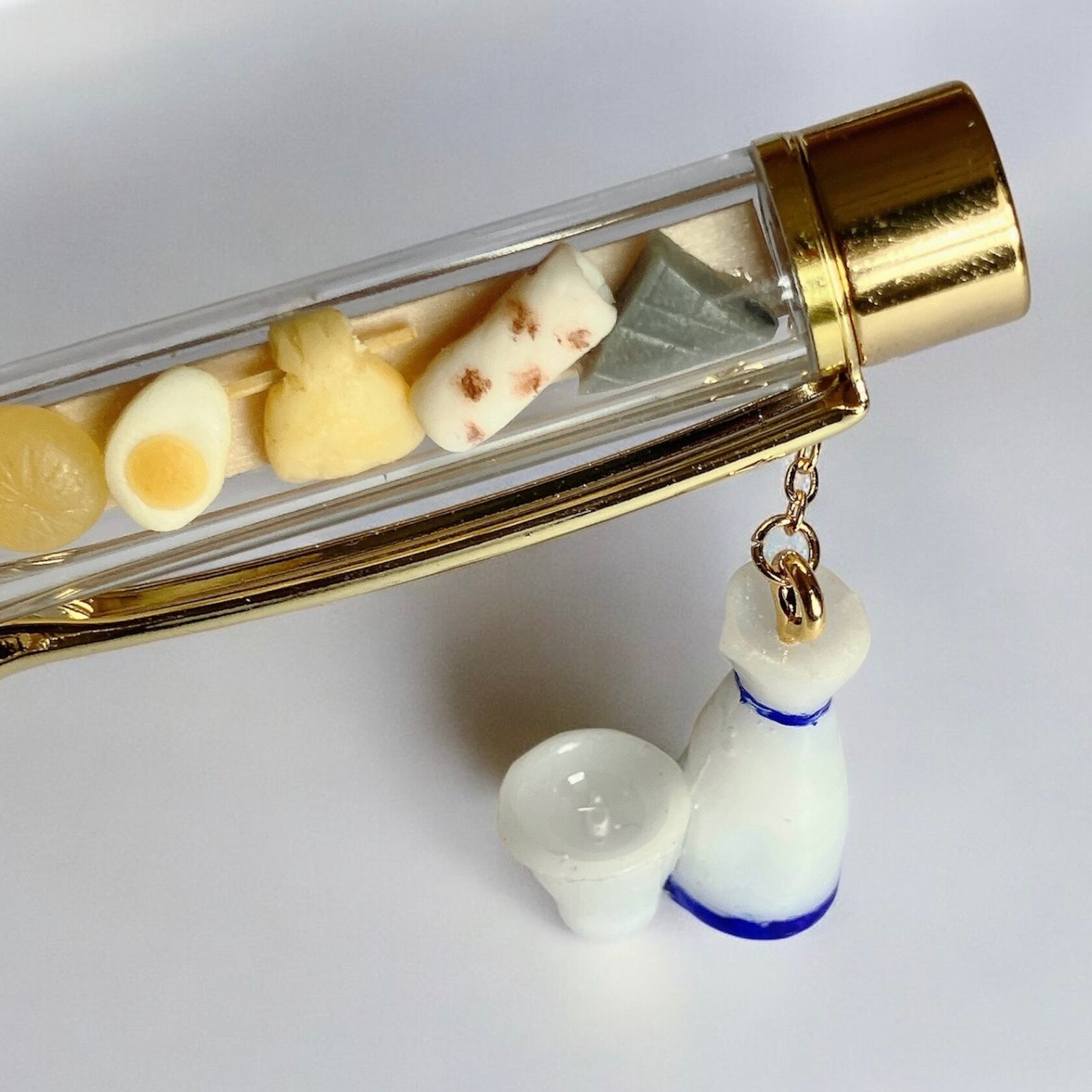 ボールペンに本物そっくりのミニチュアおでんを詰め込みました。寒い日も、忙しい日も、心をほっと温めるおでんボールペンです。